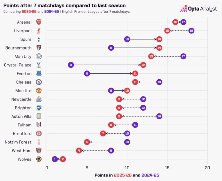 虎扑10月13日讯据OPTA数据统计,本赛季英超7轮战罢,各队积分与2024-25赛季同期有显著差异。